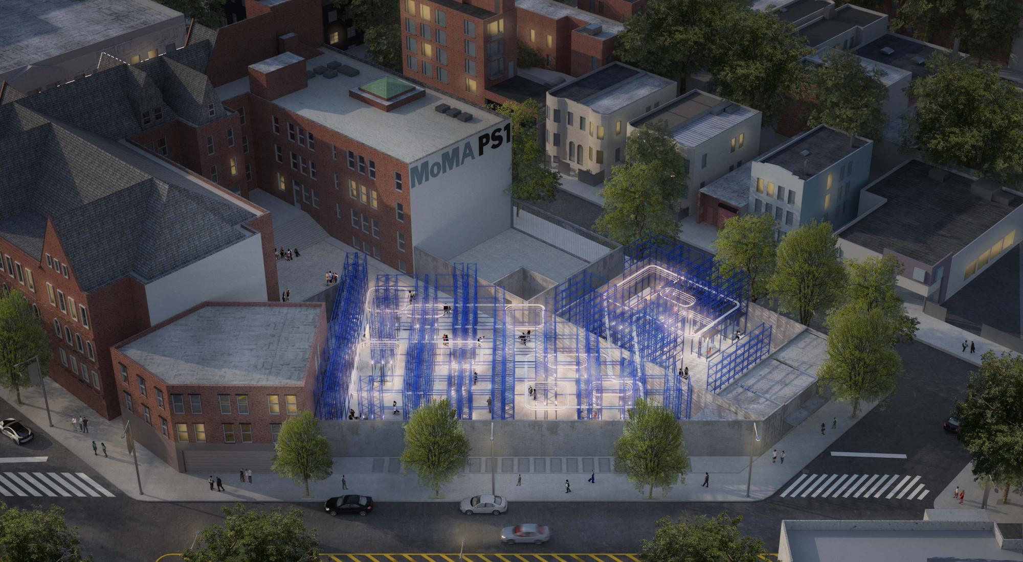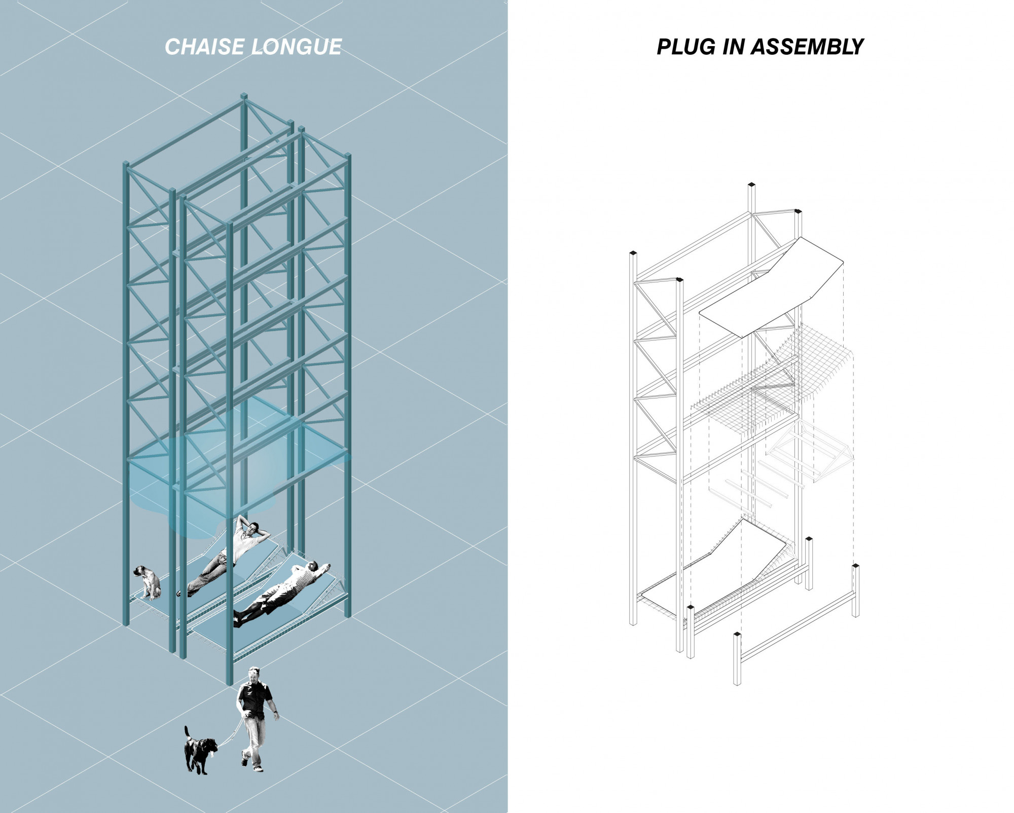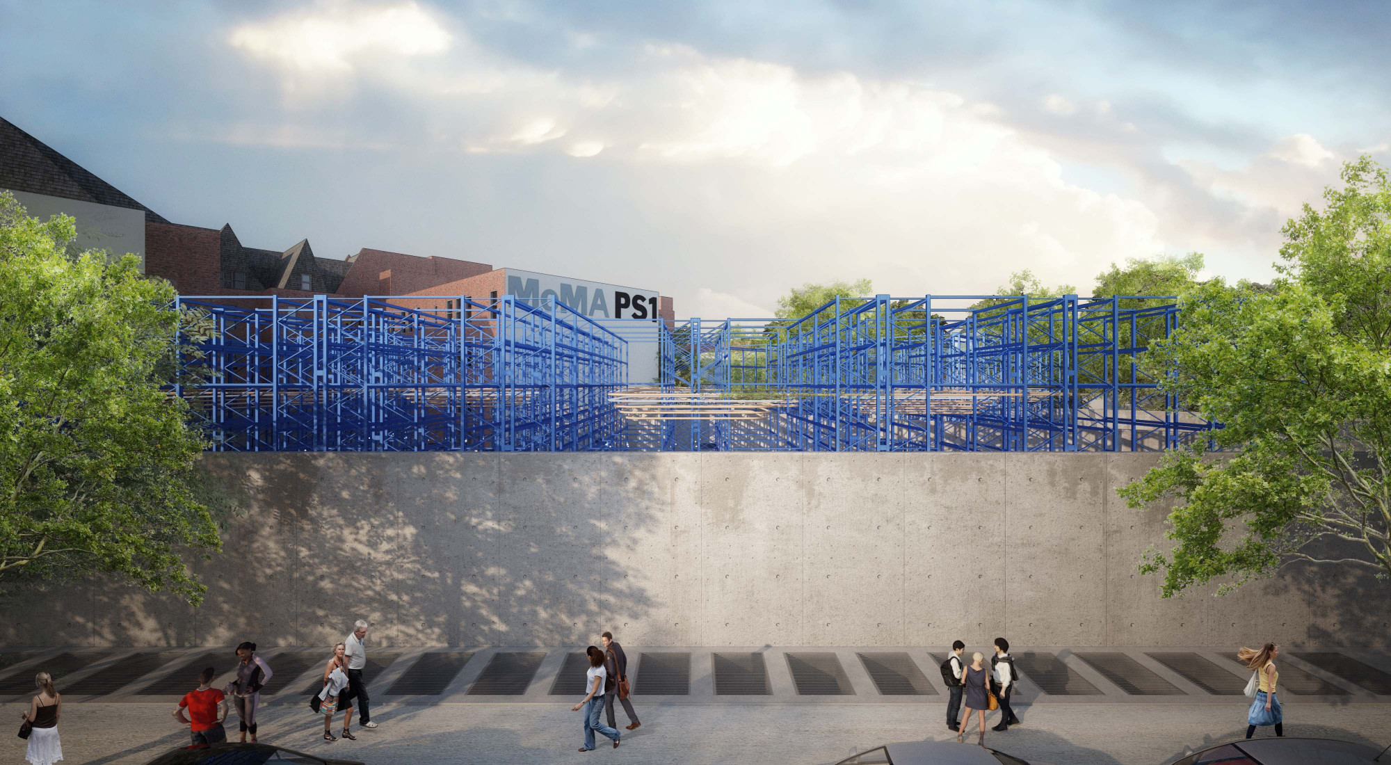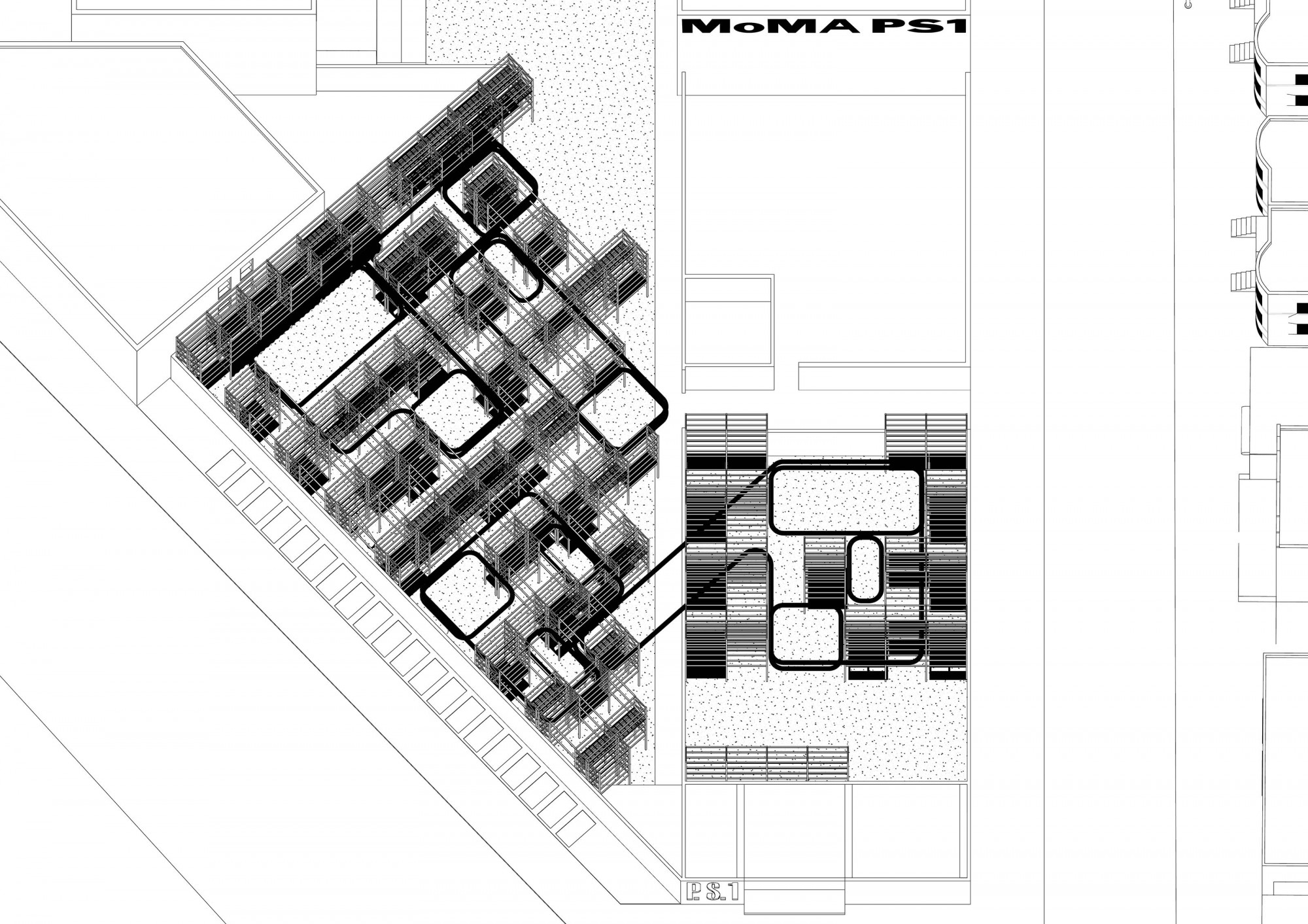 Runner-up proposal for the courtyard of MoMA PS1, under the direction of Jesse LeCavalier R+D. The project proposed intervening in the ubiquitous and hyper-fluid material systems of shipping storage and fulfillment centers, by repurposing the warehouse pallet racks as a structure for leisure.