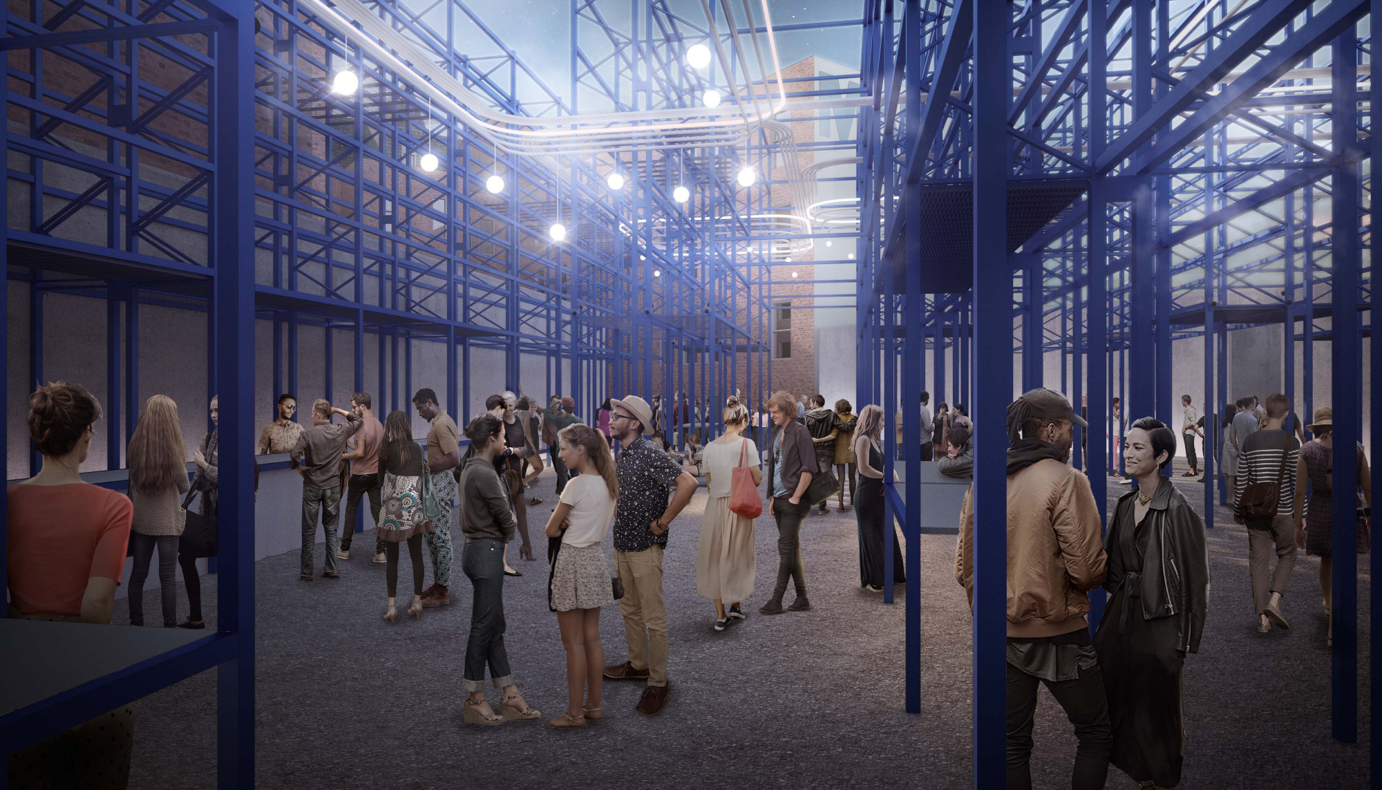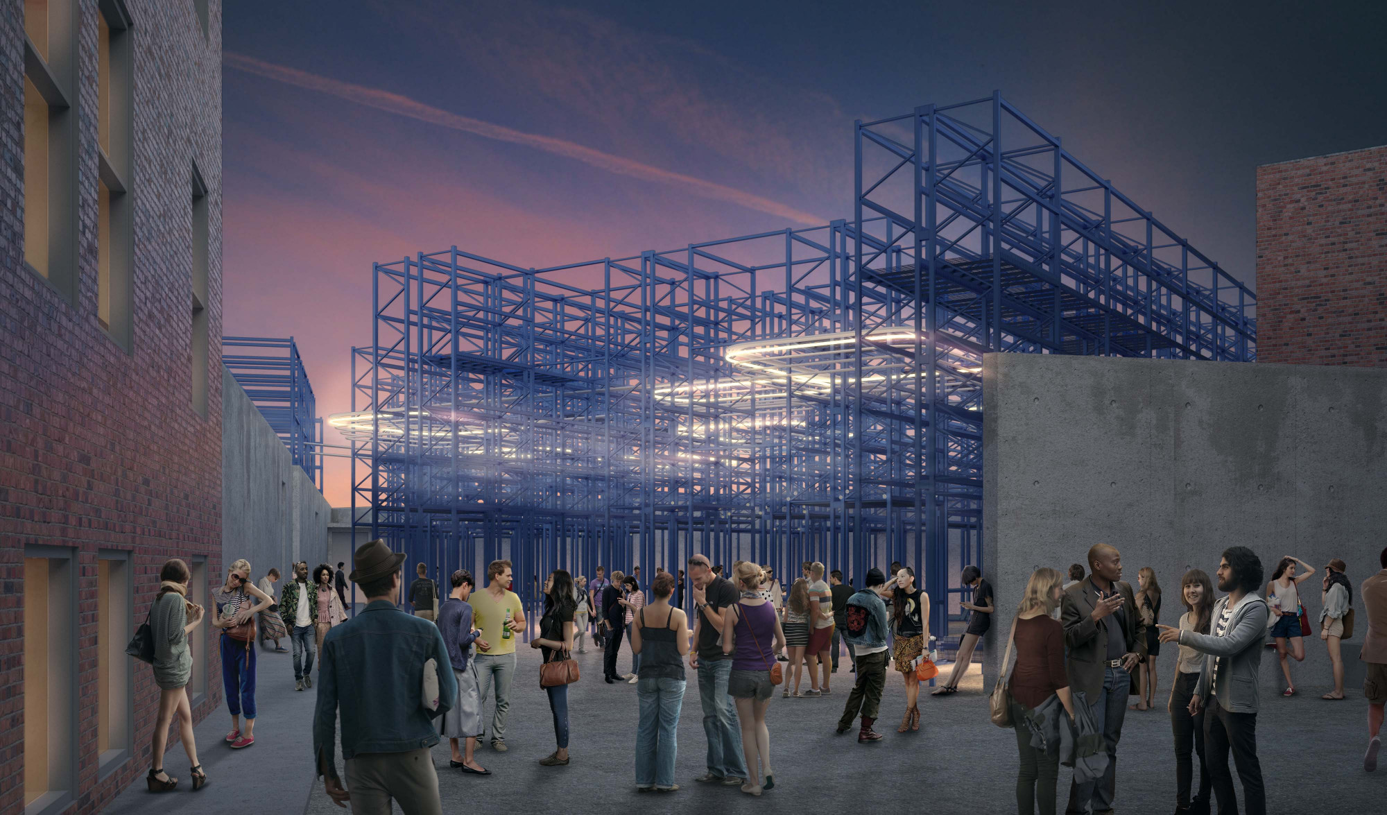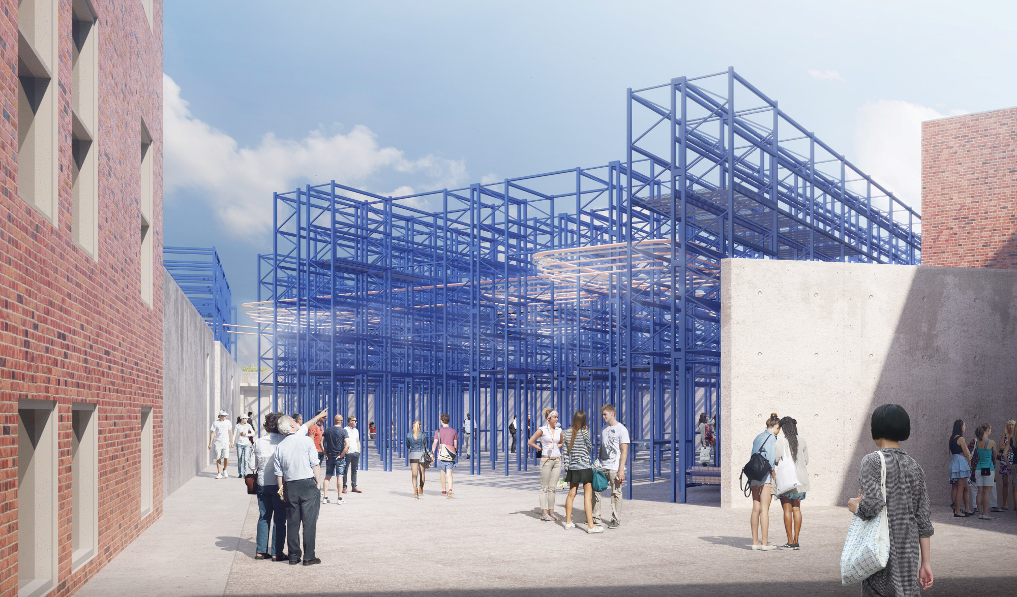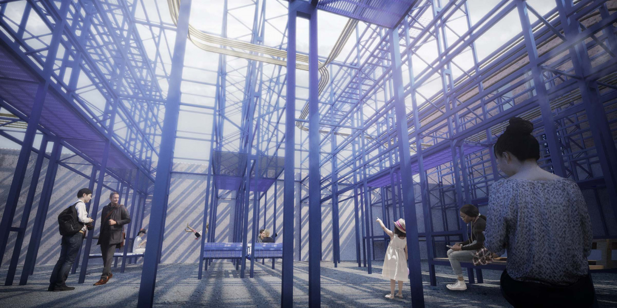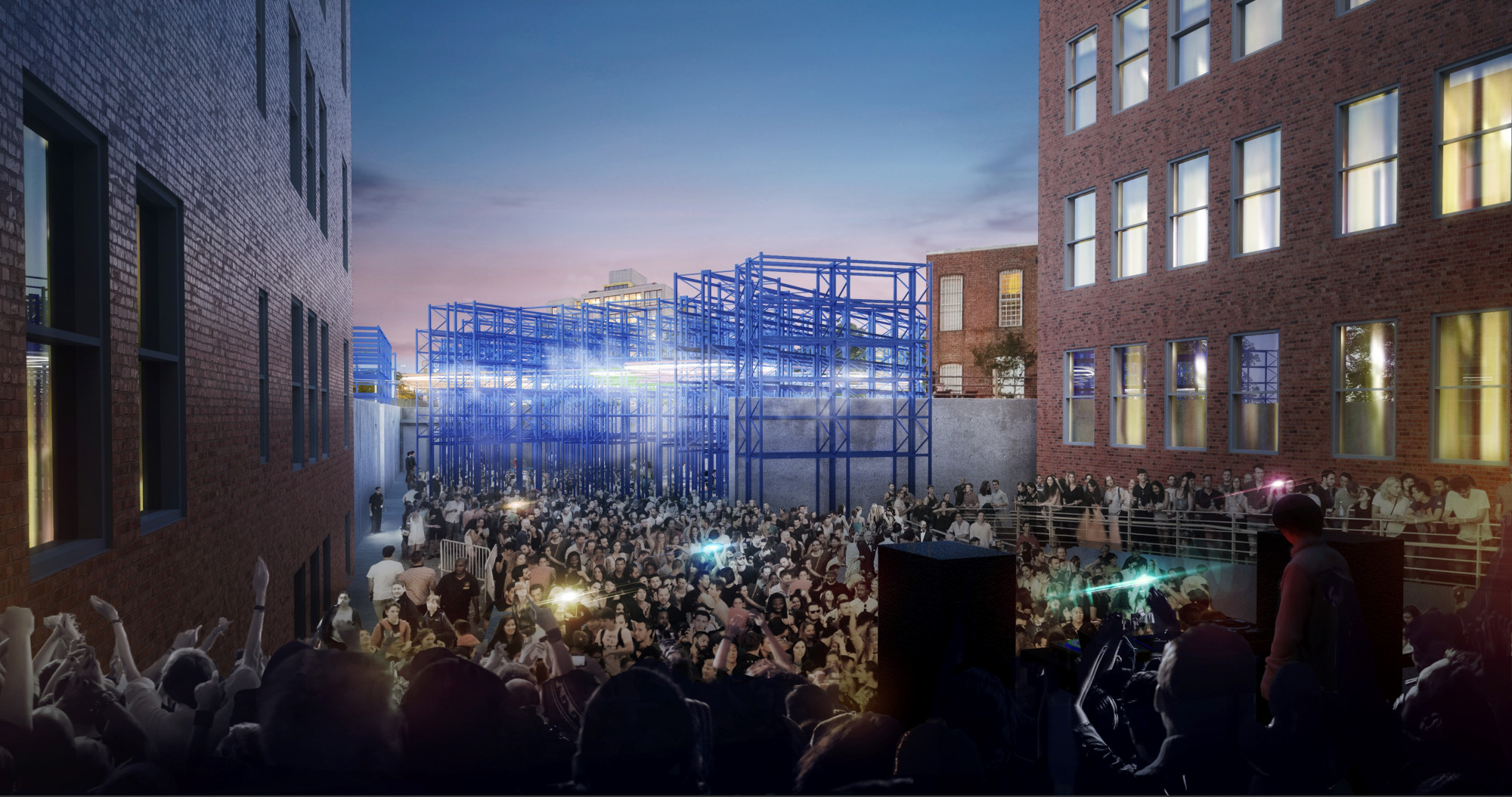 Runner-up proposal for the courtyard of MoMA PS1, under the direction of Jesse LeCavalier R+D. The project proposed intervening in the ubiquitous and hyper-fluid material systems of shipping storage and fulfillment centers, by repurposing the warehouse pallet racks as a structure for leisure.