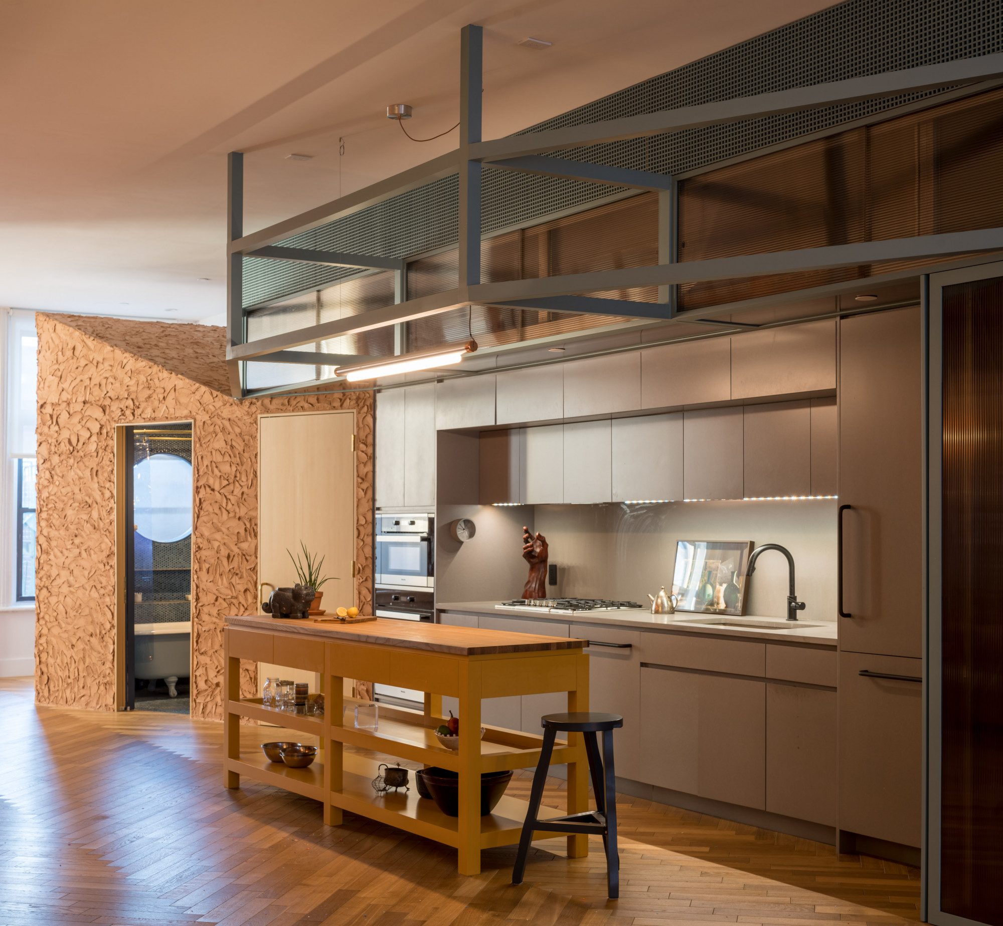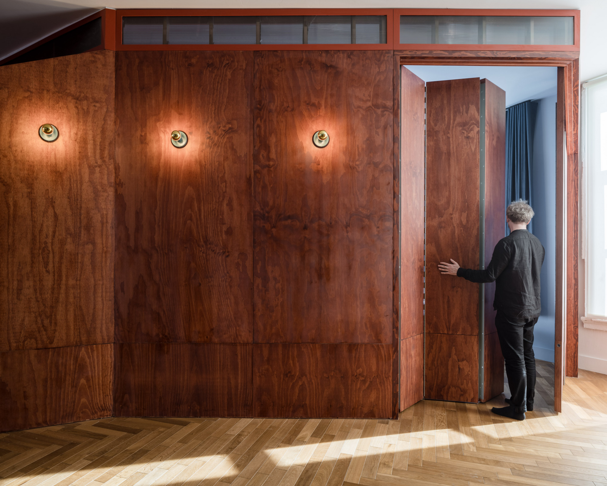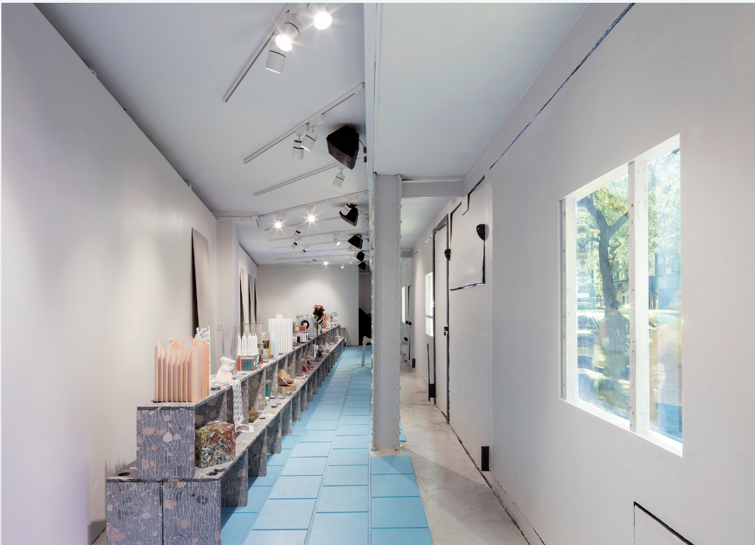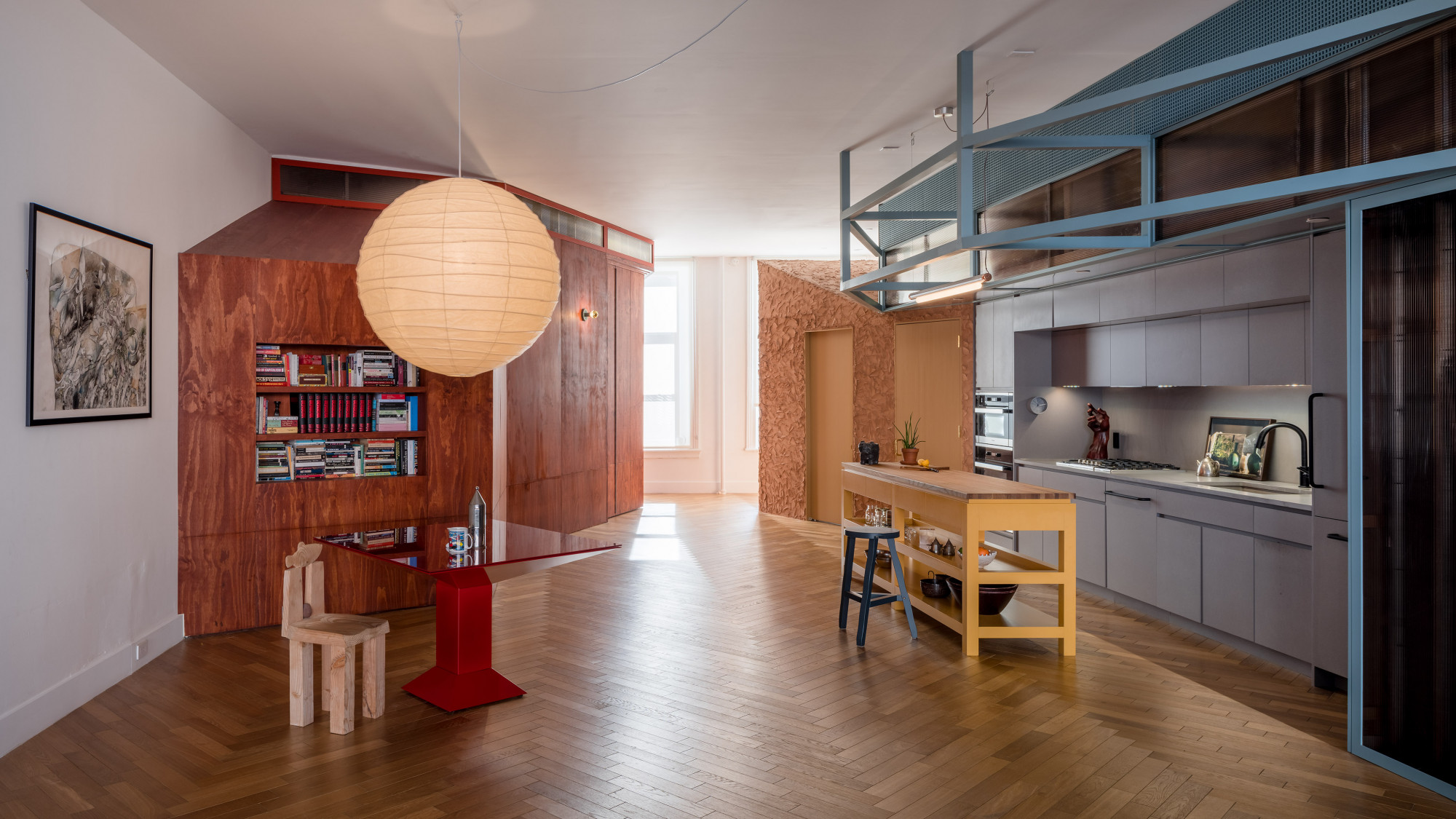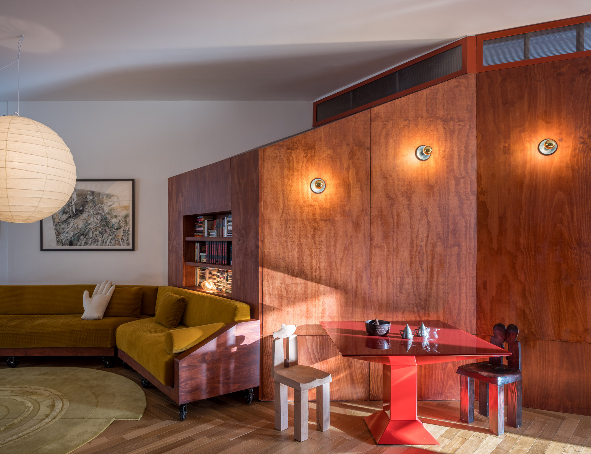 The activator and owner imagined a space in which he could live, work, and host other artist friends to develop their work. Neither just a private studio nor an art gallery, the space is equipped to welcome gatherings that operate between a dinner party and a public performance. Artists appropriate the space and become hosts themselves, expanding the communities which the project brings together. A number of volumes in red-stained pine plywood, hand-troweled earthen clay plaster, colored MDF, and back-lit smoked polycarbonate with colored wood frames and a host of moving furniture articulate these encounters and choreograph the boundaries that the project negotiates.