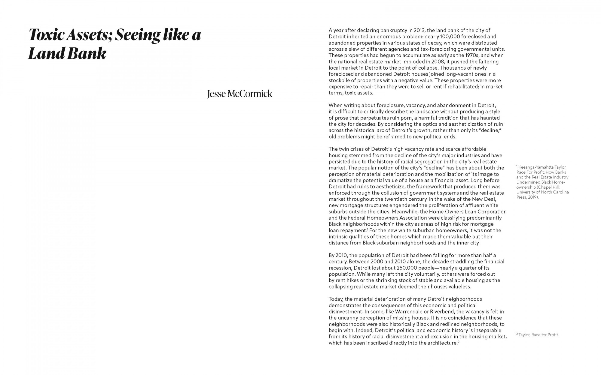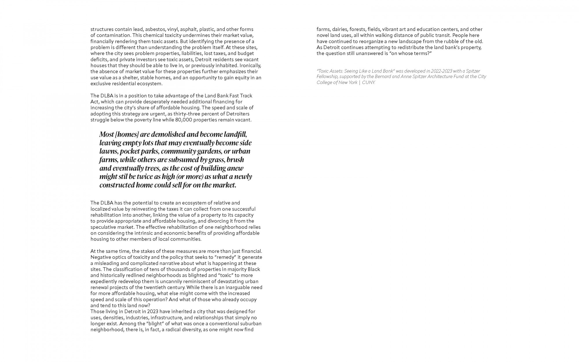 An ongoing inquiry into the practice of land banks, and their requisite architecture. This project is supported by the Bernard and Anne Spitzer Architecture Fund at City College of New York, CUNY.